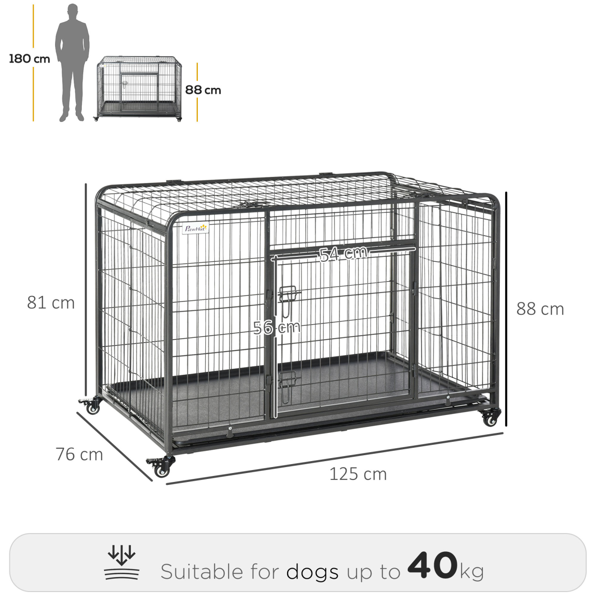 FOLDABLE: Compact size to store easily. Removable plastic tray for cleaning. Overall Dimension(without wheels): 125L x 76W x 81H cm. Overall Dimension(with wheels): 125L x 76W x 88H cm. Door: 56H x 54Wcm.
