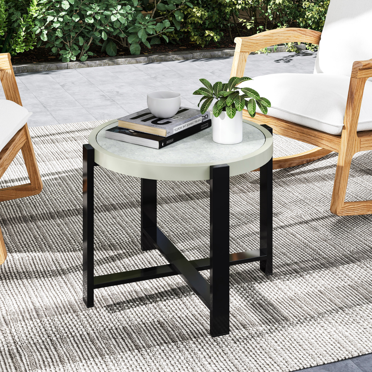 Outsunny Round Small Garden Table with Faux Marble Glass Top, Light Grey